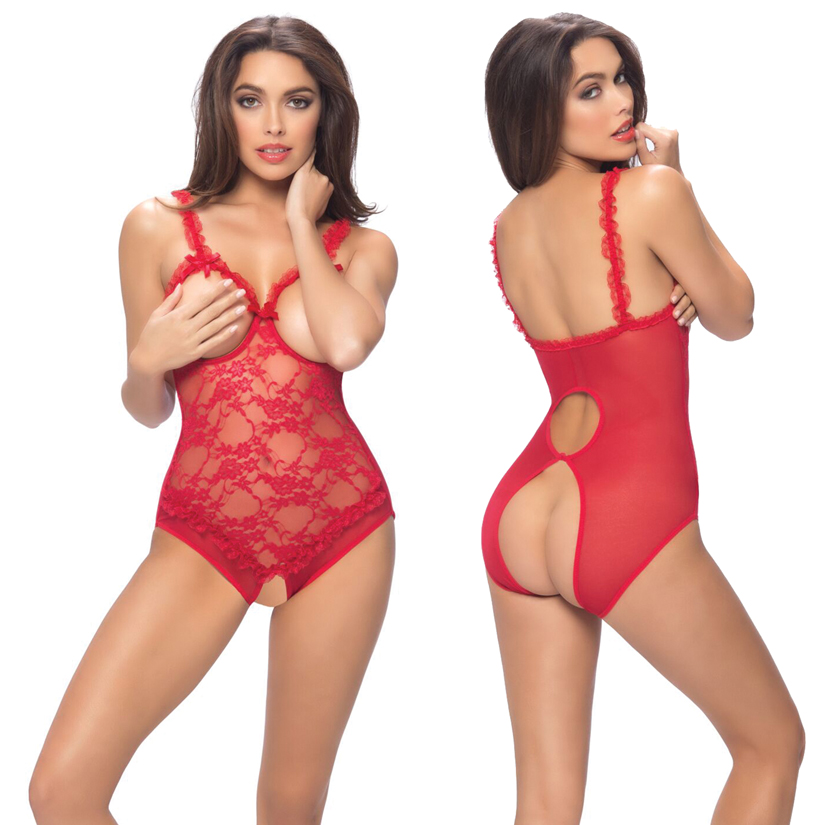 This lacy design by Oh La La Cheri is crotchless, features open cups, and an open rear.  It is detailed with ruffled trim and a bow along the center and neckline.