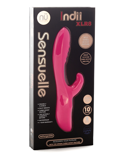 Indii takes your traditional rabbit vibe and turns it on its head. The vibe’s flexible shaft and ultra-soft ears, paired with two independently controlled motors with 10 vibrations each, take Indii to the next level. This rabbit vibe also has an added bunny kick—its turbo boost technology. At the click of a button, Indii’s vibration can jump to its highest intensity for 12 seconds, allowing you to elevate your experience to new heights.