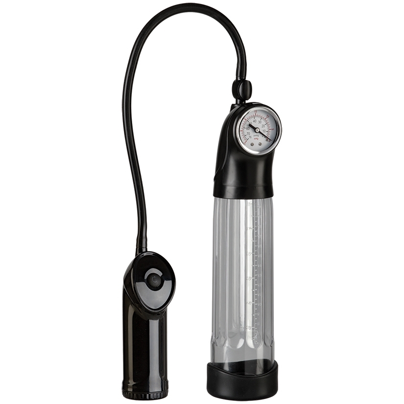 Power up for bigger, thicker erections with the OptiMALE Power Pump! Watch your growth through the large, clear vacuum cylinder, featuring a soft silicone sleeve for an air-tight seal, a stylish pressure gauge, and an easy-to-read measuring guide to monitor progress. The strong auto-pump action is easily delivered with just the push of a button, and a quick-release valve button allows for customizable pressure. The Power Pump helps draw blood flow to your penis for the ultimate erection, increasing your size and sexual satisfaction! Made of phthalate-free, body-safe materials. Requires 4 AA batteries
