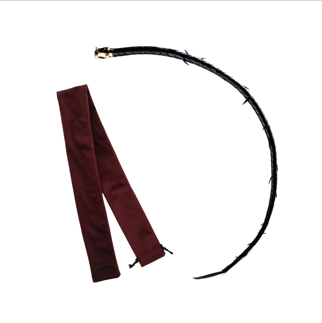 The whip of 33.5 inches is elegantly ornamented with soft thorns and vigorous blossom as an analogy of dangerous love and fearless struggle.